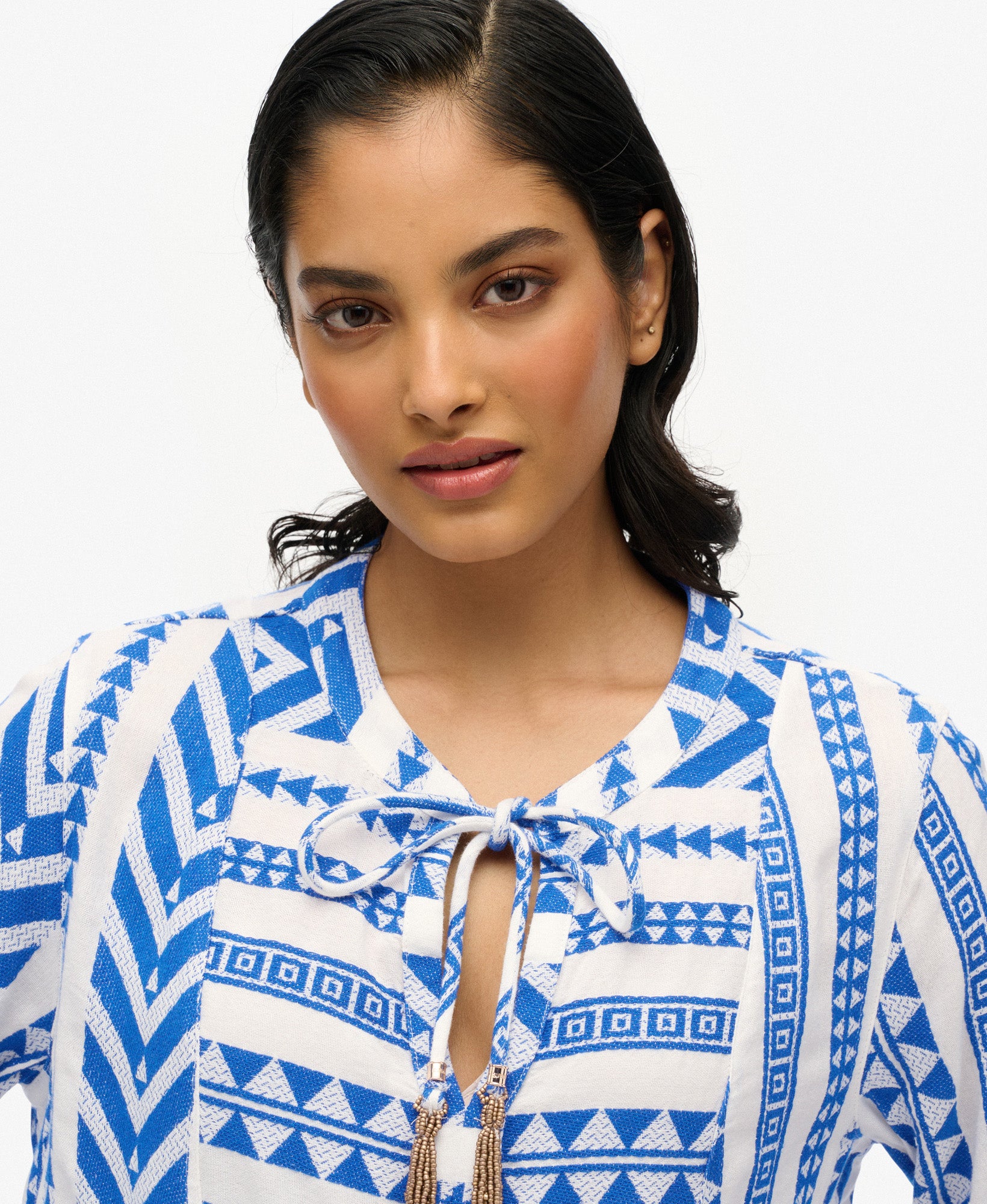 Ibiza Long Sleeve Tiered Mini Dress | Ecru Blue Emb
